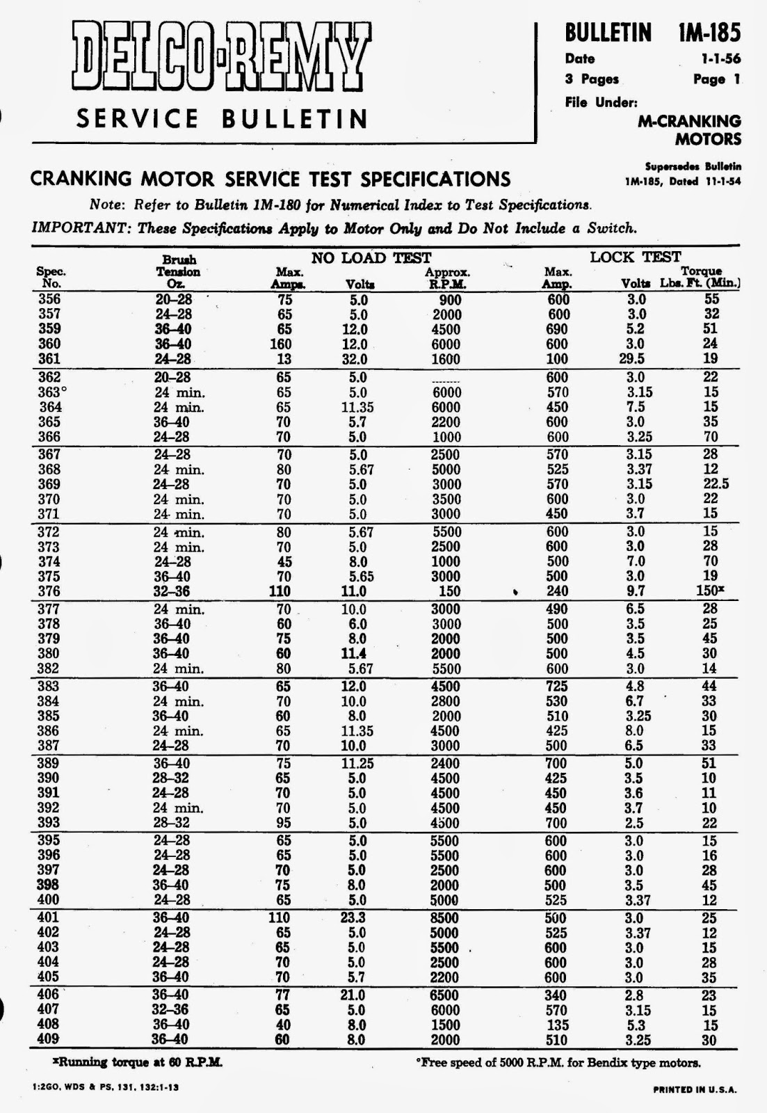 The second Cranking Motor Test Bulletin is 1M-185 Cranking Motor Service Test Specifications, 1-1-56, 3 pages. It gives the Brush Tension, Cranking Amps, Volts, and rated RPM. as well as other information. Spec 2377 for this starter is on page 3, below.